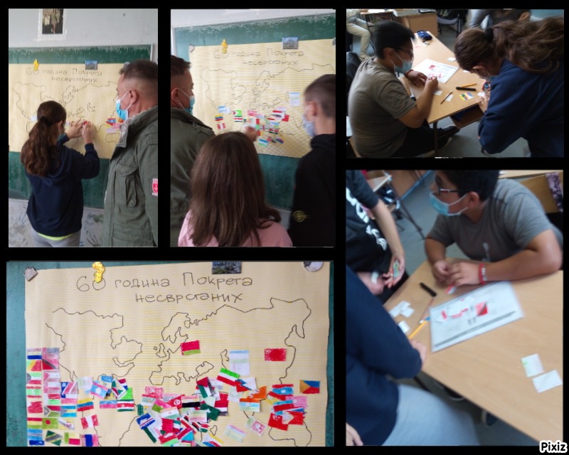 Поводом 60 година од оснивања Покрета несврстаних у нашој земљи се опет одржава самит овог покрета који је имао изузетно важну улогу у процесу деколонизације и борбе земаља Трећег света за стицање независности и равноправан статус са осталим земљама света. Овај покрет је кроз политику мироњубиве коегзистенције чинио свет бољим и супротстављао се себичним интересима великих сила које су настојале да обезвреде народе Азије, Африке и Јужне Америке у настојању да сачувају свој идентитет. Овај догађај је био и повод да наставник географије и наставница историје ученицима кроз забавне и поучне игре представе ову организацију, најистакнутије њене чланове кроз време, кључне принципе покрета и значај самог покрета како за његове чланице, тако и за читав свет. Ученици су имали задатак да обоје заставе земаља учесница попкрета по утврђеном обрасцу датом на сваком папирићу, а потом их залепе на карту. Док су то радили, чули су причу о историјату покрета и најистакнутијим члановима. Наставници су представили и које су бројне користи које би наша земља могла да има од обнове чланства у покрету