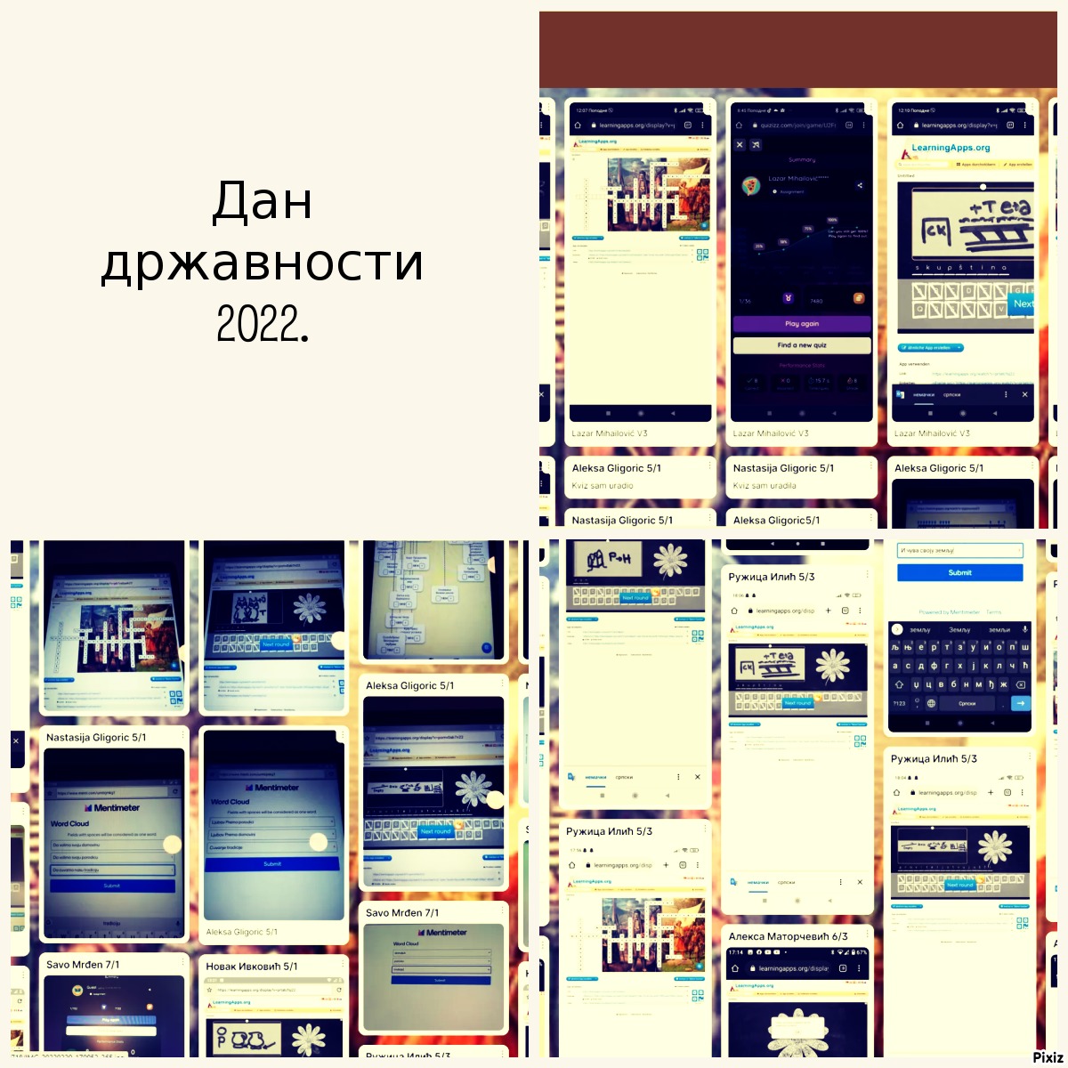 П оводом Дана државности ученици су опет добили од наставнице историје креативне задатке преко Google учионице- требало је да препознају славне војводе Првог и Другог српског устанка у квизу, реше три ребуса, укрштеницу посвећену Српској револуцији, поређају хронолошки догађаје везане за Српску револуцију и у ментиметар унесу шта за њих значи родољубље. Све задатке је требало и да усликају и убаце под својим именом на виртуелну таблу. Велики број деце се одазвао што је знак да су активности добро осмишљене и за децу интересантне.