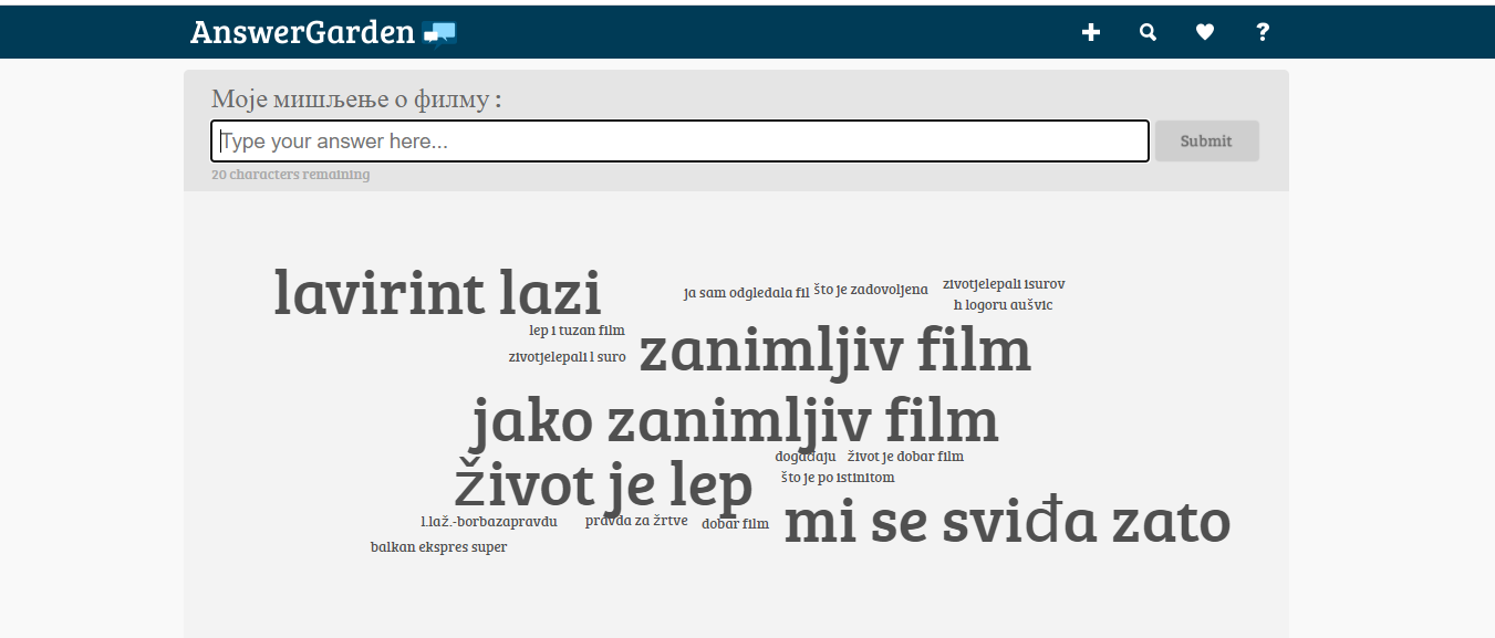 Дан сећања на жртве холокауста, 27.јануар је опомена целом човечанству да се страхоте Другог светског рата никада не понове. Ученици наше школе су ове године тај дан обележили тако што су погледали филм о холокаусту по избору, а своје утиске о филму оставили путем веб алата Answer garden. Ученици су на тај начин остварили већи степен емпатије и покушали да кроз ликове у филму и њихове трагичне судбине представе време Другог светског рата.