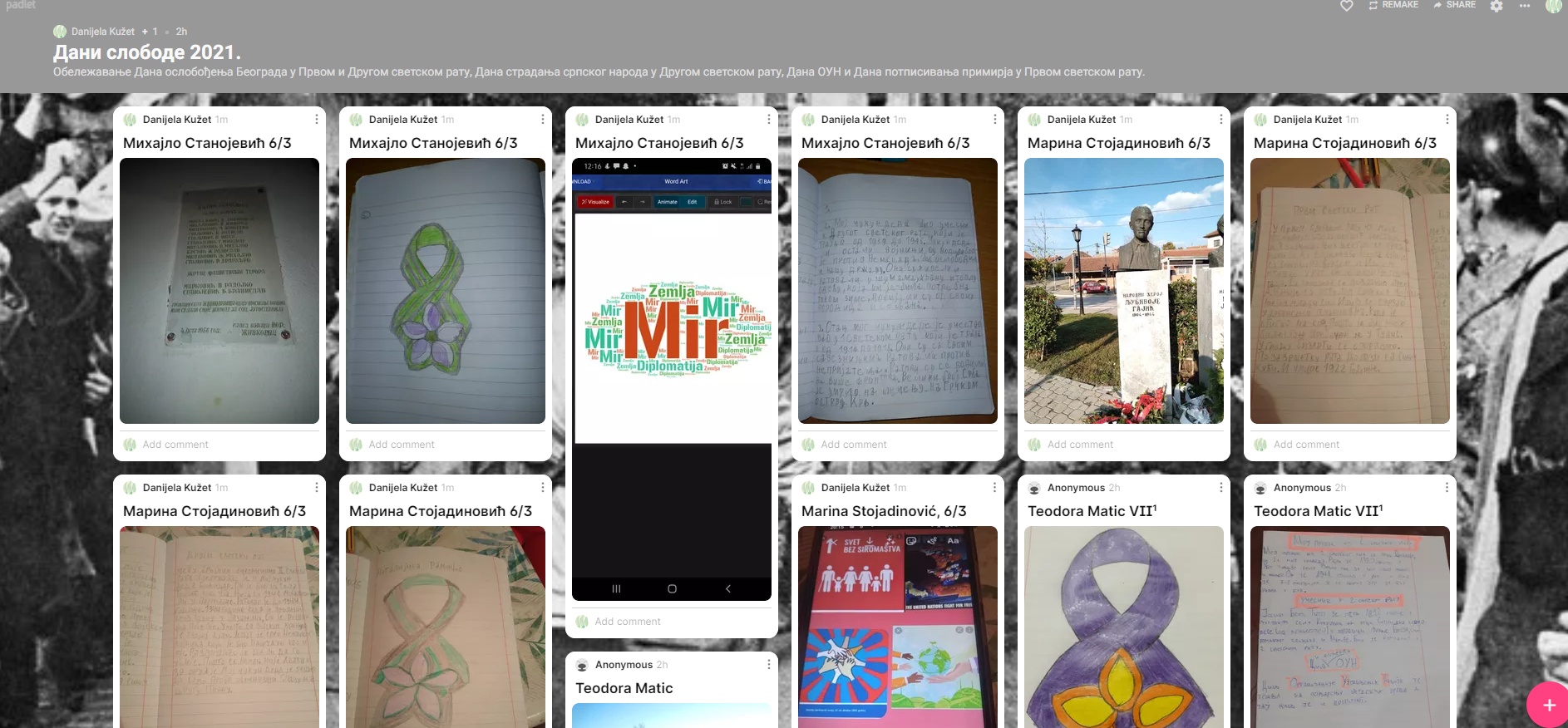 Поводом Дана слободе- ослобођења Београда у Првом(1.новембар) и Другом светском рату(20.октобар), сећања на Дан страдања српског народа у Другом светском рату(21.октобар), Дана Организације Уједињених нација(24.октобар) и Дана потписивања примирја у Првом светском рату(11.новембра) наставници историје и географије су дали затаке ученицима на својим часовима који су реализовани у дигиталном окружењу кроз виртуелни тематски час. Ученици су на падлет постављали слике споменика везаних за страдање Срба у Другом светском рату, писали о својим прецима који су учествовали у Првом и Другом светском рату или славним учесницима рата, цртали симбол потписивања примирја у Првом светском рату- Наталијину рамонду и преко Wordart-a правили разне облике описујући у три речи Организацију уједињених нација. Њихове надахнуте радове и ентузијазам можете видети путем линка и слика које прилажемо.