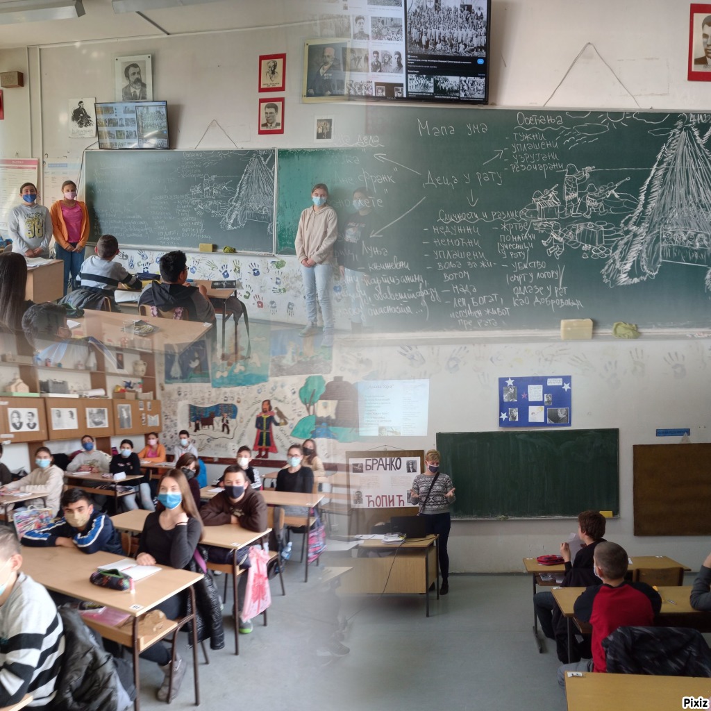 Наставница српског језика Маријана Жујевић- Николић и наставница историје Данијела Кужет су посветиле тематски час деци у рату и подсетиле ученике на тешку судбину њихових вршњака у ратовима током историје. Поводом Дана сећања на српске жртве Другог светског рата наставница српског је наставно градиво повезала са обележавањем овог дана и кроз наставне садржаје из српског језика- књижевна дела "Орлови рано лете", "Крвава бајка" и " Дневник Ане Франк" са ученицима анализирала положај деце у рату, њихова страдања, неостварене наде и жеље. Наставница историје је подсетила на остале чињенице везане за Крагујевачки октобар, али и на децу учеснике рата, децу која су страдала у логорима и стратиштима током Другог светског рата на простору наше земље и света. Ученици су приказали догађаје о којима су радили и на табли, учествовали у анализи књижевних дела и одгховарали на питања везана за њих, учествовали у дискусији о значају мира и родољубља за све људе света.