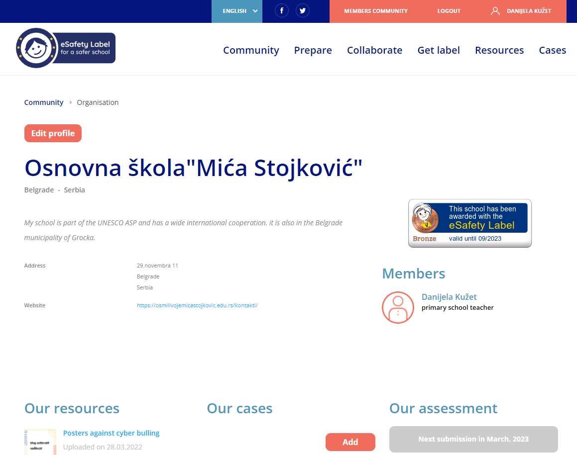 Захваљујући пројекту eTwinning eSafety world на ком наши ученици уче како да безбедно користе интернет, шта је насиље на интернету и како га избећи, који су облици медијских манипулација током једног од састанака колега наставника задатак нам је био и да се улогујемо на сајт: https://www.esafetylabel.eu/ и добијемо ознаку безбедног интернета. Чињеница да наши ученици користе бројне апликације, безбедне платформе за рад и учествују на пројектима који подижу ниво интернет безбедности је значајна за остваривање више компетенција значајних за наставу. Велико ми је задовољство што помажем ученицима у развоју ових компетенција и оснажујем их у знањима неопходним за безбедније коришћење интернета.