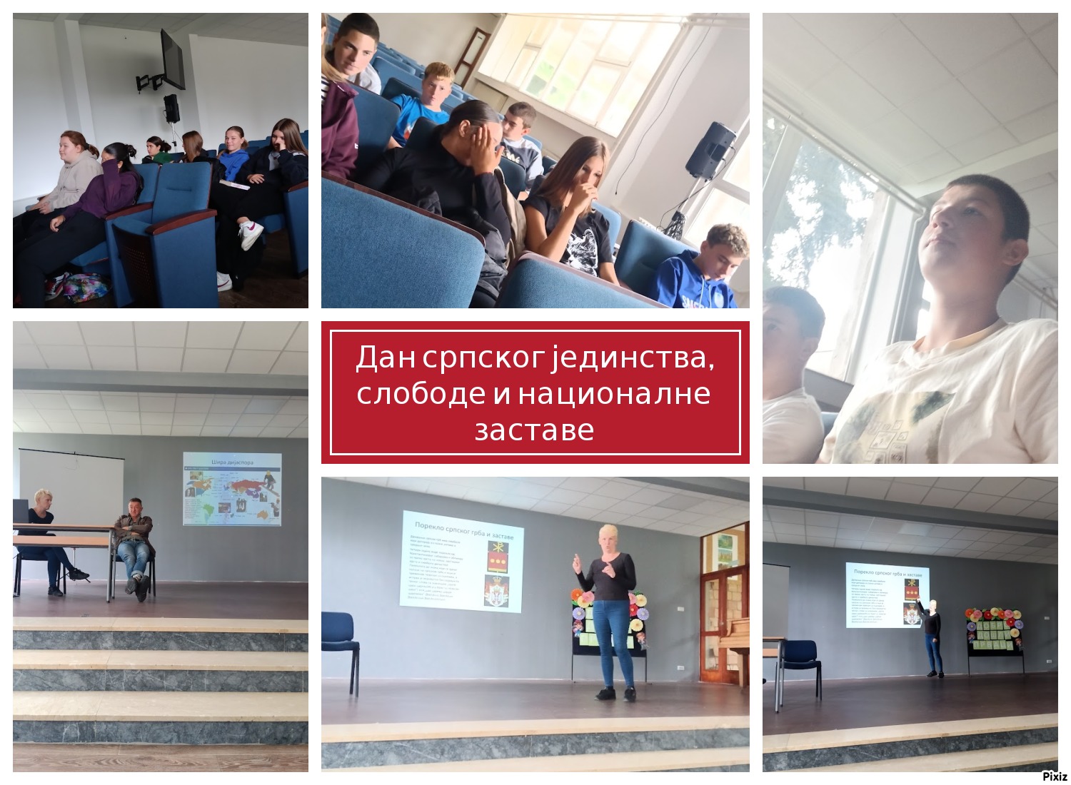 Поводом Дана српског јединства, слободе и националне заставе наставник географије Слободан Милићевић и наставница историје Данијела Кужет су одржали угледни час у суботу 14.9.2024. ученицима VIII/1. Наставник Слободан је ученицима објаснио појам дијаспоре, узроке исељавања Срба, навео просторе где има највише Срба ван Србије и навео разлоге "одлива мозгова"указујући на тешке последице ове појаве по будућност наше земље. Наставница Данијела је објаснила развој српског грба и заставе кроз време, симболе који се на њима налазе дајући и преглед државности и хералдике нашег народа. Ученици су пажљиво пратили и постављали бројна питања показујући да су заинтересовани за часове на којима се промовише српска култура, родољубље и негује очување националног идентитета.