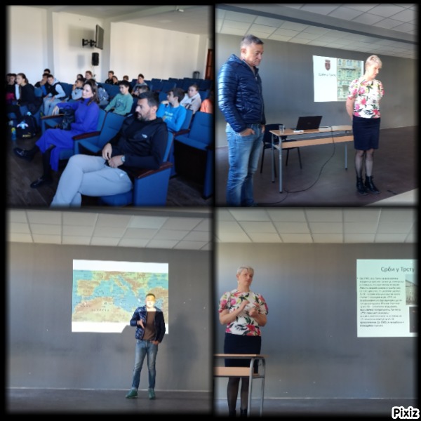 Тематски час: Срби у Трсту Поводом студијског путовања наставника наше школе и обиласка Трста наставник географије Слободан Милићевић и наставница историје Данијела Кужет одржали су тематски час о овом граду и његовом значају за Србе. Часу су присуствовали директор школе, Владимир Бокић, логопед Јована Савић, наставница ликовног Јасмина Вучићевић и ученици 8/1.Наставник географије је представио повољност физичко географског положаја Трста, одлике привреде и одлике дијаспоре.Открио је благотворне утицаје Медитерана који су допринели и економском и природном богатству града.Указао је на значај културе живљења за становнике Трста, тајне кутке града и особености хране, пића и начина живота који га одликују.Наставница историје је дала преглед историје Трста од неолита до периода Хладног рата. Приказала је атракције града и приче везане за њих. Повела присутне трагом истакнутих помораца из Херцеговине и Црне Горе који су уткали своје судбине у темеље овог космополитског града.Уз раскошну презентацију са палатама Срба из Трста, градским трговима, мостовима, црквама, кафићима и лукама присутни су током овог часа осетили дух Медитерана, а разумели и улогу српског народа у развоју културе и привреде Трста.