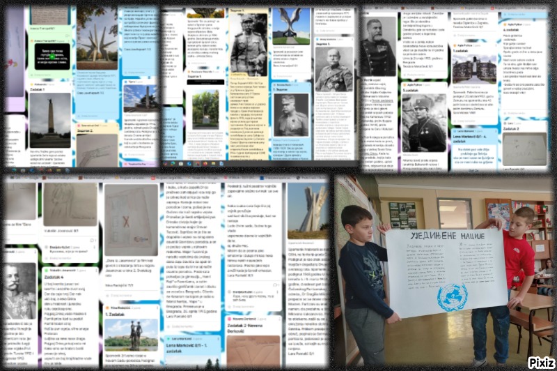 Обележавање Дана слободе и Дана ОУН Поводом Дана слободе и обележавања Дана ослобођења Београда у Другом светском рату(20.10.), Дана сећања на српске жртве у Другом светском рату(21.10.), Дана ОУН(24.10.), Дана ослобођења Београда у Првом светском рату(1.11.) и Дана потписивања примирја у Првом светском рату(11.11.) ученици су на часу историје могли да ураде следећих пет задатака и добију 5. 1. За обележавање ослобођења Београда у Другом светском рату требало је ставити слику споменика везаног за Други светски рат на падлет уз опис зашто је подигнут и потпис ученика- споменици се нису могли понављати! 2. За обележавање Дана сећања на српске жртве у Другом светском рату требало је илустровати причу, песму или филм везан за страдање Срба у Другом светском рату. Илустрацију уз потпис ученика окачити на падлет. 3. За обележавање Дана ОУН урадити квиз преко линка и потписати се приликом рада. 4. Поводом Дана ослобођења Београда у Првом светском рату требало је навести једну приповетку или песму која се односи на Први светски рат уз мишљење о том делу. 5. Поводом Дана потписивања примирја у Првом светском рату требало је навести једног славног ратника или ратницу из Првог светског рата уз причу о њему или њој и пописати рад. Свих пет радова требало је објавити кликом на плус на падлет уз потпис ученика.