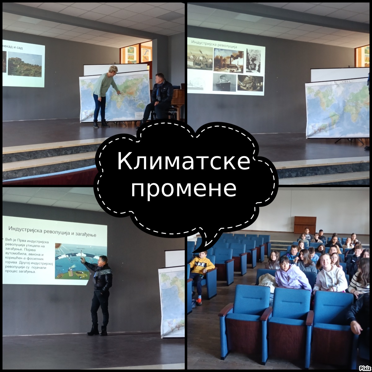 У петак, 29.11.2024., наставник географије и наставница историје су одржали тематски час о климатским променама. Ученицима су представљене теорије Милутина Миланковића о међуледеним и леденим добима, појаве које су доводиле до промена климе кроз време и факторе који данас утичу на промену климе. Сазнали су који су узроци ефекта стаклене баште, који су природни фактори који доводе до шумских пожара, а како све човек може да их изазове, какве погубне последице има промена климе по биљни и животињски свет, човека и културну баштину, зашто су земљотреси и поплаве сада разорнији и екстремнији него некад, да ли се озонски омотач променио у односу на претходне епохе и многе друге занимљиве податке о променама климе. Овај час је подстакао радозналост ученика и њихову еколошку свест и грађанску одговорност указујући им на значај заштите животне средине.