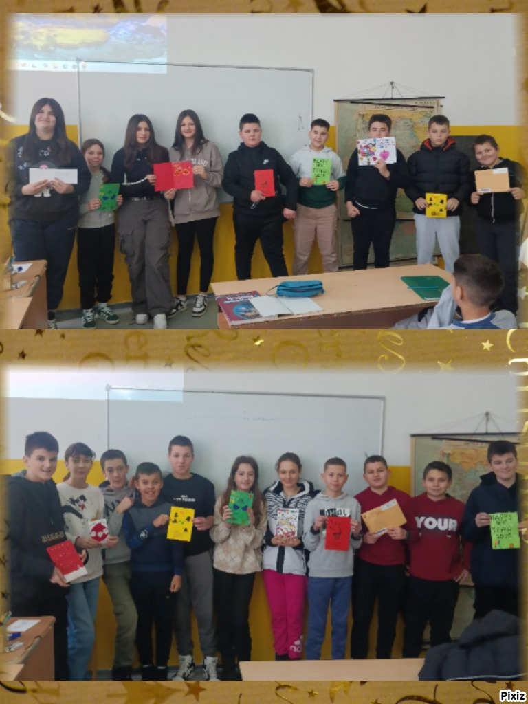 У чесници eTwinning пројекта "Cultural Atlas of Worldwide Discoveries" су разменили новогодишње честитке. У том циљу су формирани међународни тимови и састављени парови који су имали задатак да направе и пошаљу честитке једни другима. Култура слања честитки је у данашњој ери интернета помало заборављена и ученици су се одушевили кад су примили честитке од својих другара из Института "Abate Ferdinando Galiani"из Монтора у Италији од наставнице Луције Гаруфи и ОШ"Маре Швел- Гамиршек" из Врбање у Хрватској од учитељице Катице Варешевац.